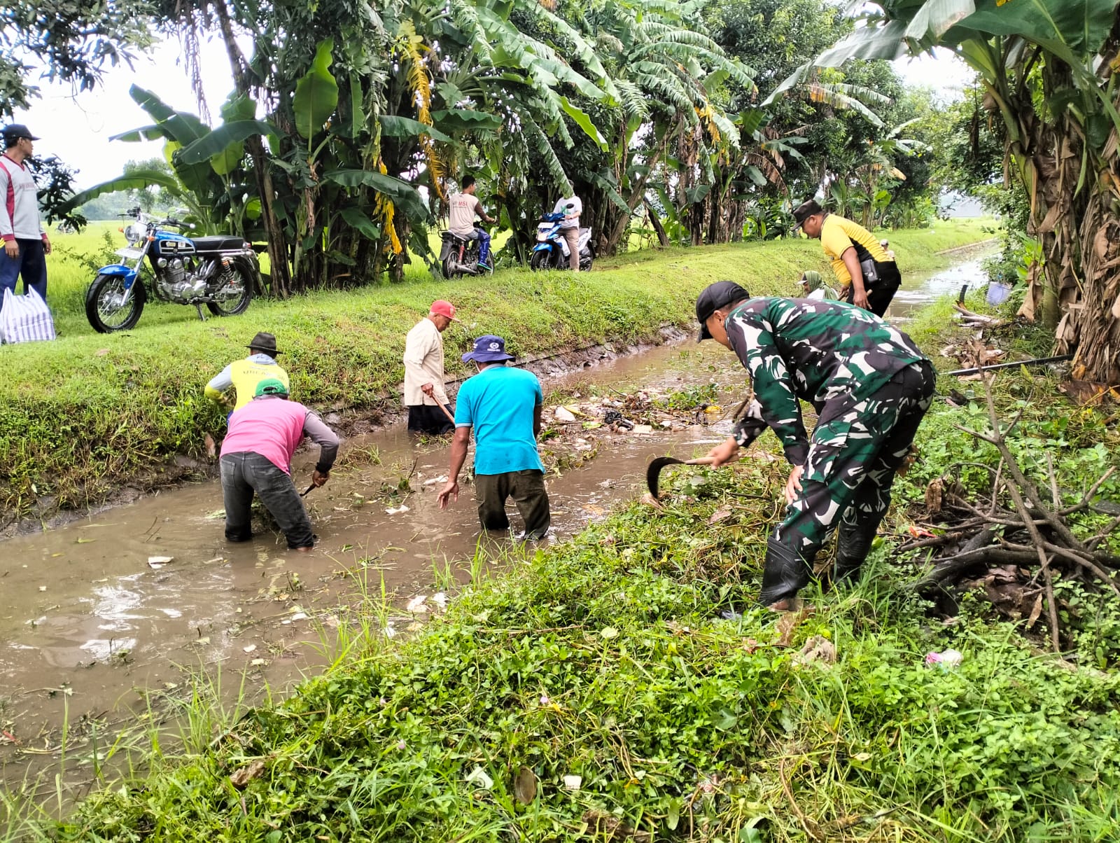 Kegiatan tersebut difokuskan pada pembersihan sampah, ranting, dan endapan lumpur yang berpotensi menghambat aliran air sungai. Babinsa bersama warga secara gotong royong membersihkan sepanjang aliran sungai guna memperlancar arus air.